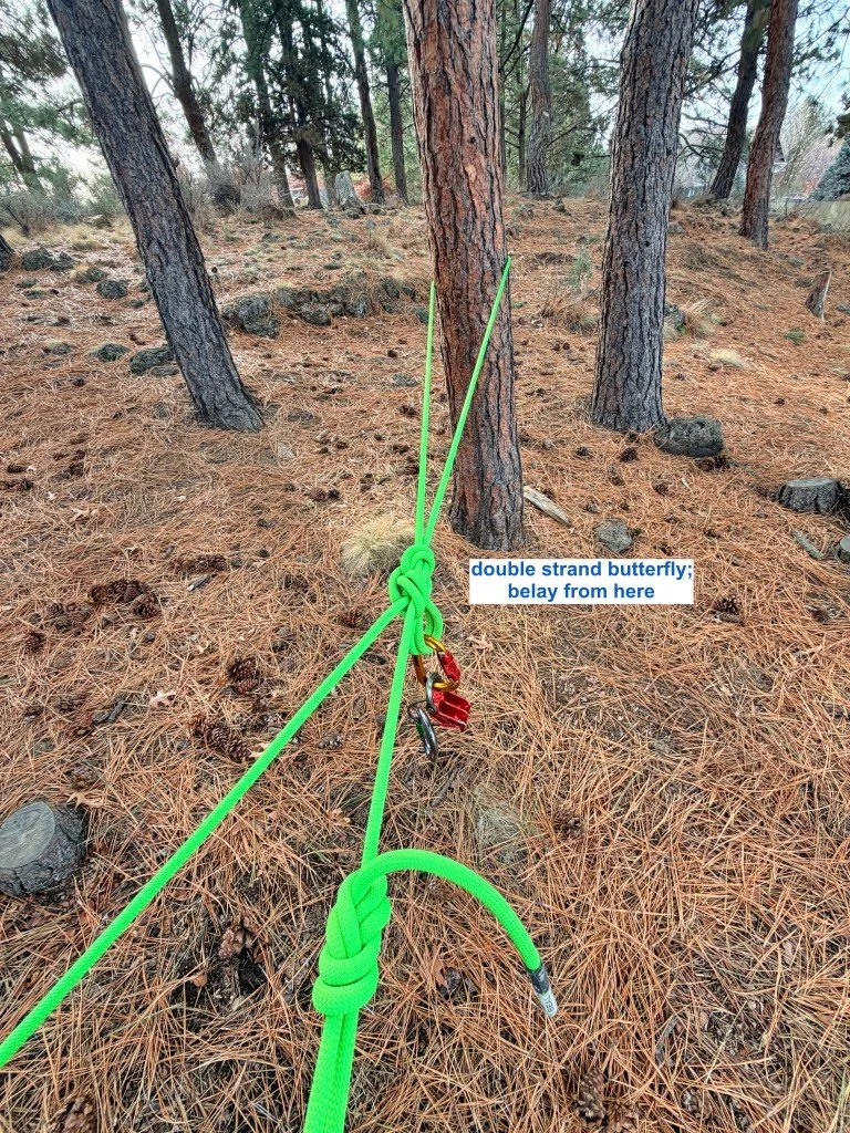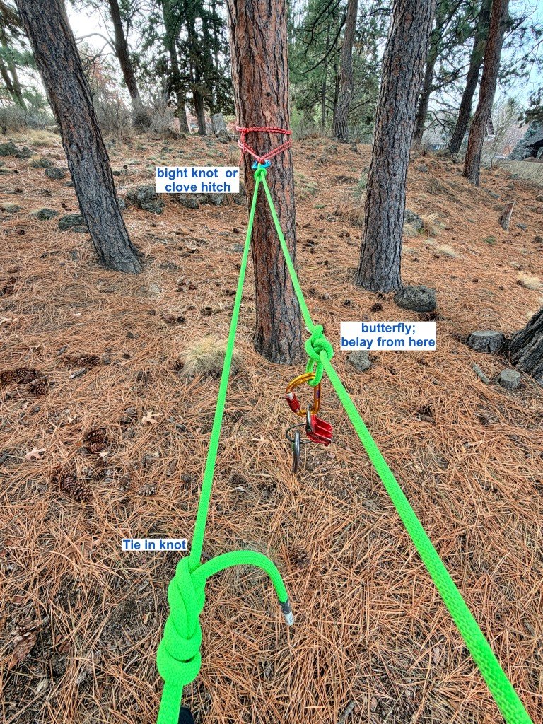 Downsides to this method: 1) The rope can slide down to the base of the tree, so anticipate this. 2) If your partner falls or needs a take, it loads the strand you’re tied to, so this might be more comfortable if you're sitting on a ledge. 3) Chance of getting tree sap on your rope, yuck.