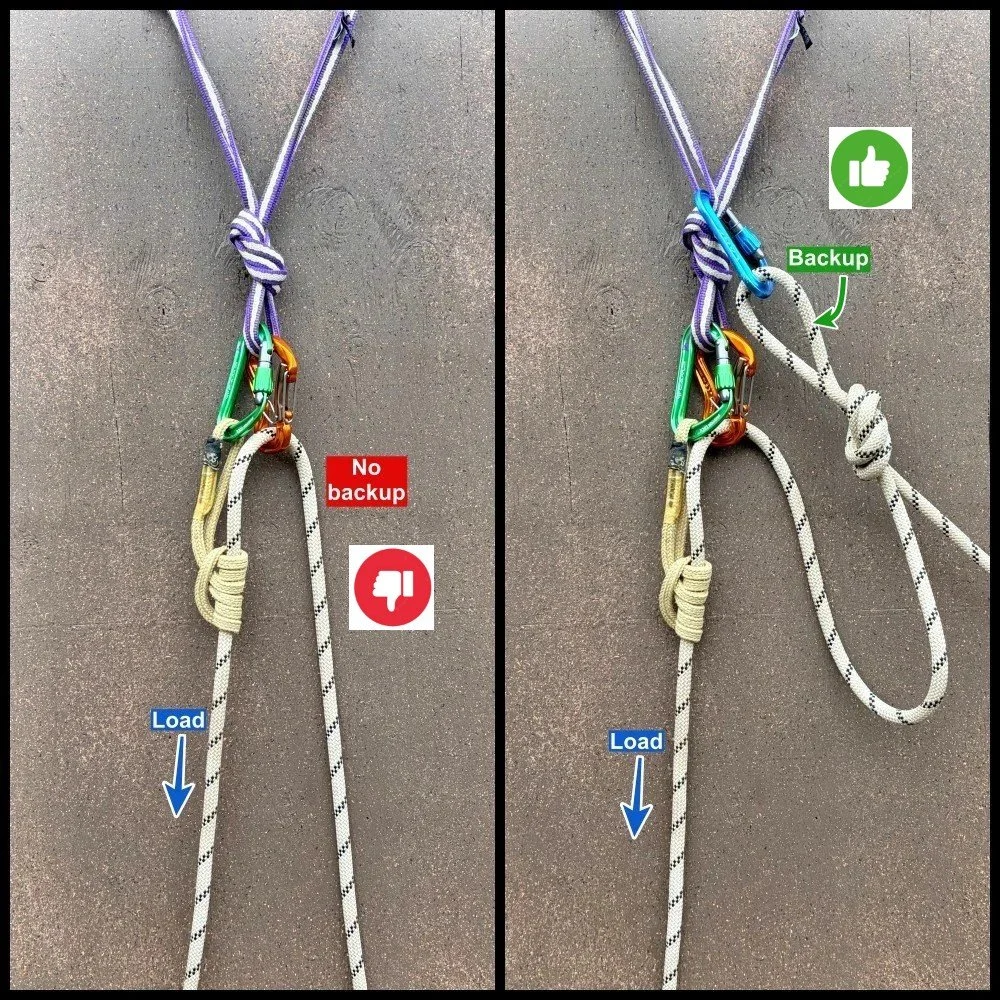 Below right: if the friction hitch slips or fails, the load is caught by the backup knot clipped to the blue carabiner. Much better. As you pull more rope through your haul system, you can add additional backup knot(s).