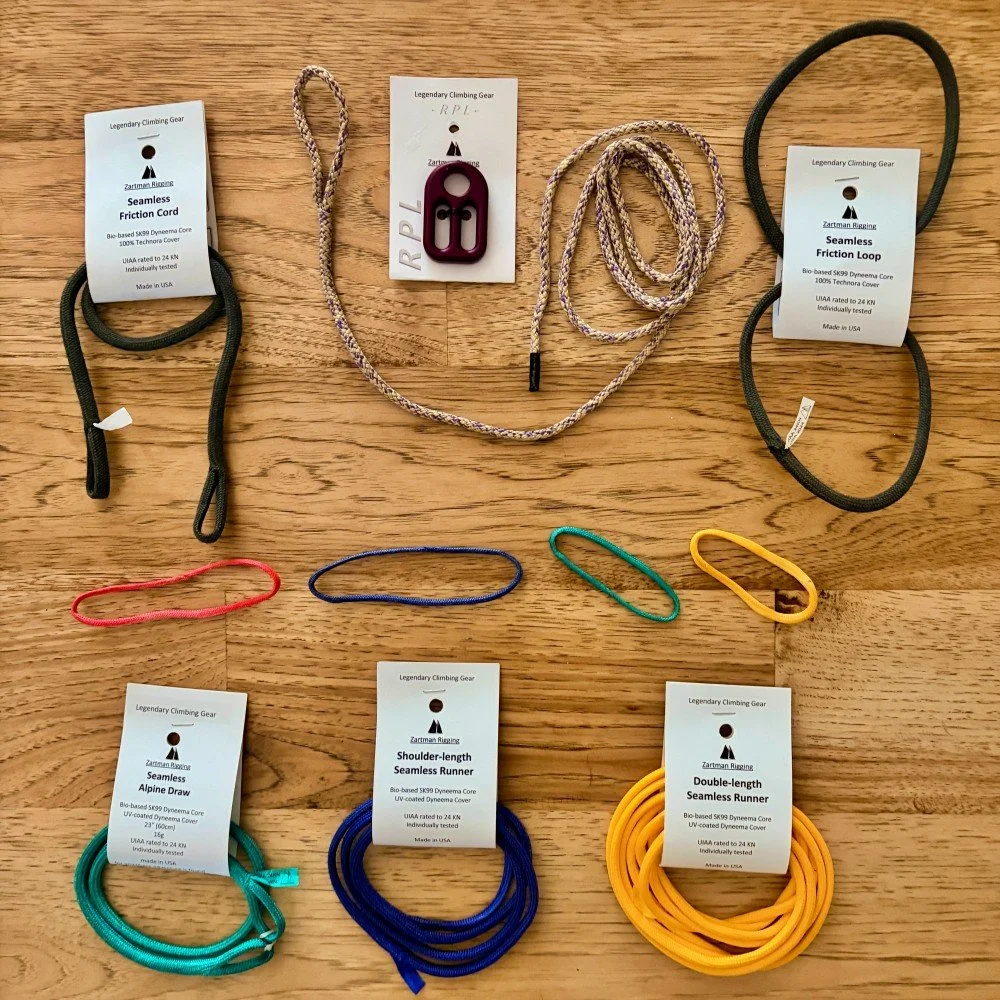To improve gear, makers keep pushing for lighter and stronger. Zartman Rigging takes this another step, with their high tech spliced, not sewn, soft goods made for climbers. Here's an overview.