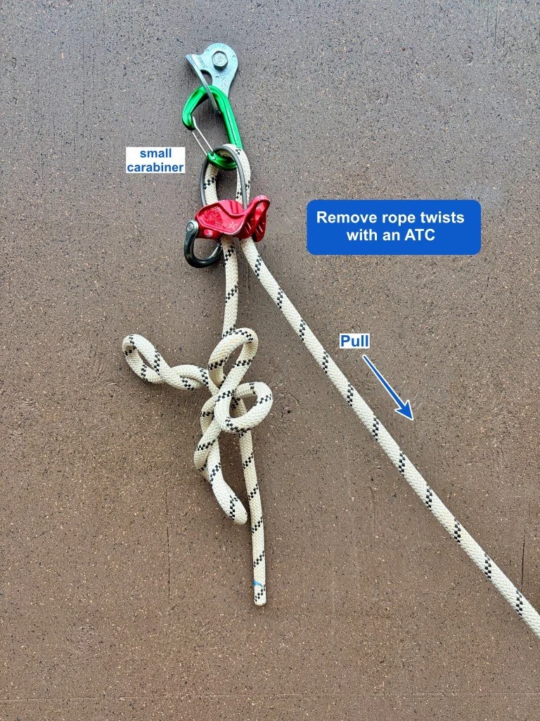 If your rope has some evil pigtails in it, it's really important to get those out as best you can before you pull your rappel rope!