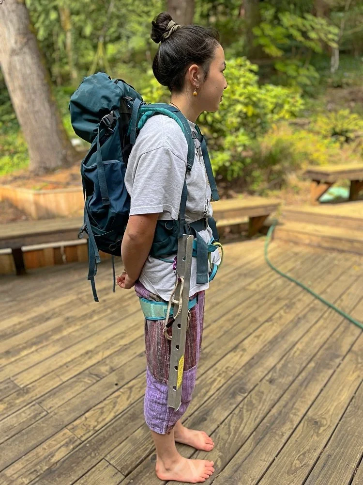 Now, clip that carabiner to your harness gear loop or to your backpack strap. The picket should hang down vertically, pretty much out of your way.