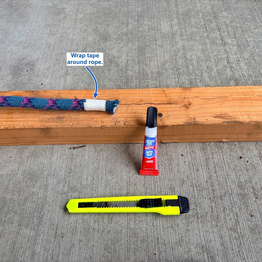 Important: the chemicals in superglue may not play nicely with most ropes. In this case we're using them only at the very END of the rope, which will never see a load. When you're doing this, be careful not to get glue on any other part of your rope.