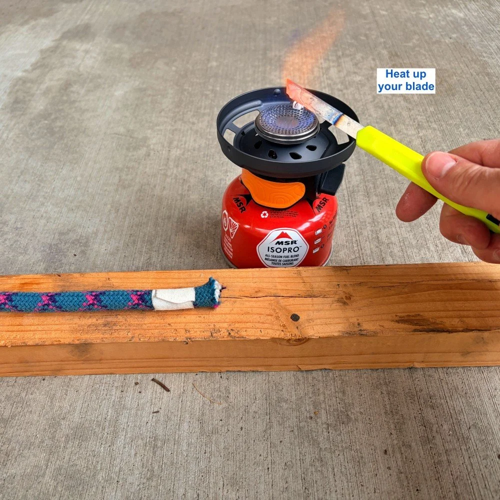 Use a disposable utility knife, and NOT any sort of a good knife and especially one that’s ever going to touch food. The blade is going to have some discoloration and baked on melted rope yuckiness.