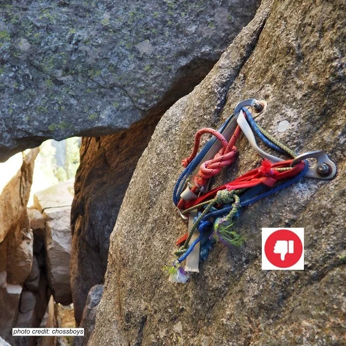 A big rat’s nest of cord, with multiple slings ranging in age and quality, is hard to evaluate and potentially dangerous.