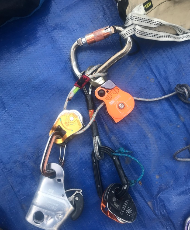 The Z cord - 7 mm cord, start with about 5 meters. If you find you have too much extra cord, trim some off. Could be a thinner 5.5 mm static spectra cord for a slightly more efficient pull. Be sure and tie a large stopper knot on the end to prevent your hardware from sliding off accidentally. (Pro tip, bring a second spare Z cord, in case the first one gets trashed.)