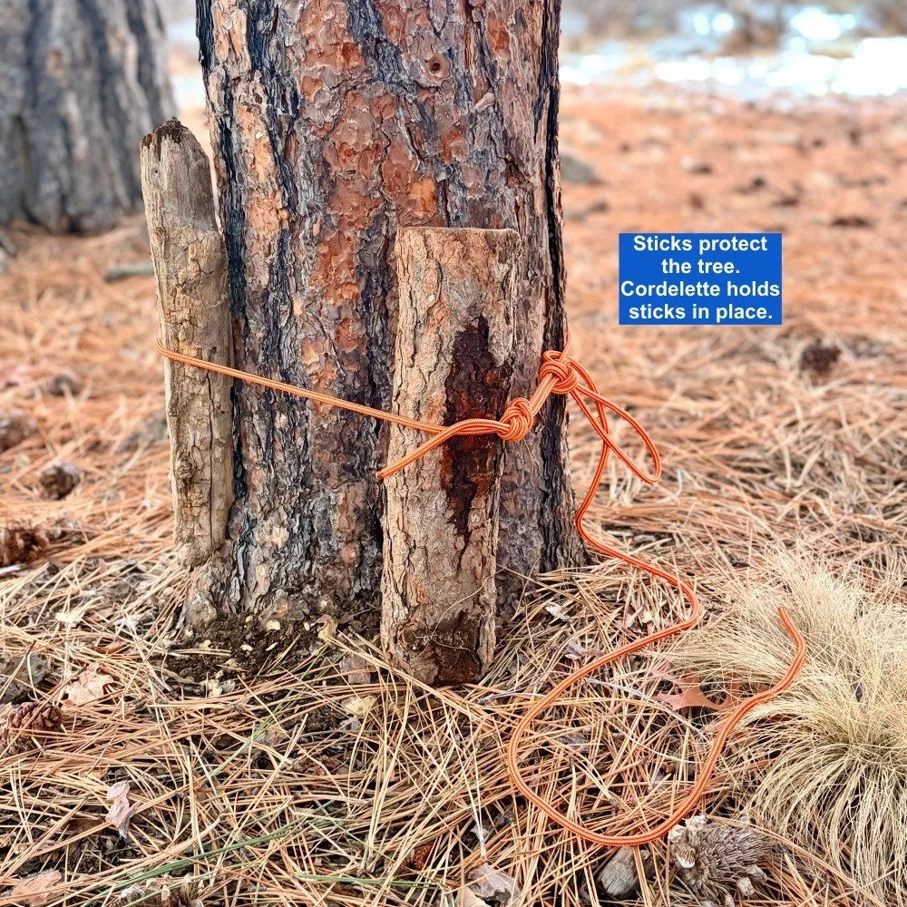 Small diameter cord or sling, especially if rigged with a girth hitch, might damage the bark.