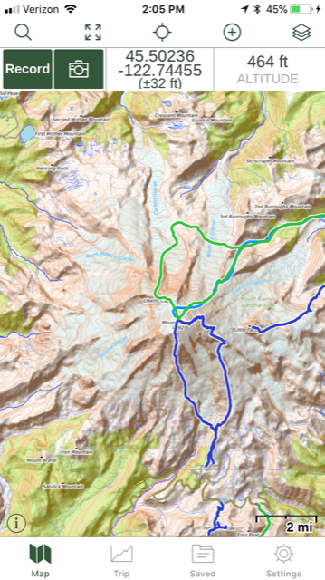 Below is a phone screengrab of Mt. Rainier in Gaia GPS Open Topo map layer, with climbing GPX tracks in blue and green.