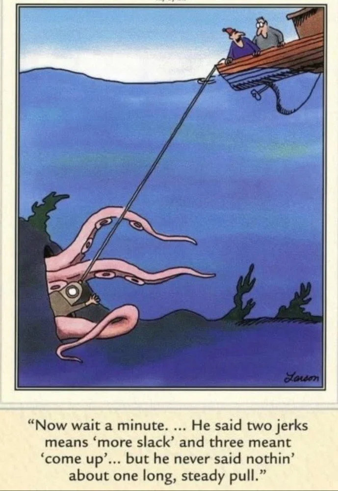 Whoops! Backup is partially holding the weight of the climber, instead of having the full weight on the thread. This never properly tests the anchor for the last person.