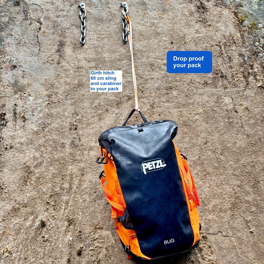 Girth hitch a 60 cm sling to your pack when you’re on a multi pitch.