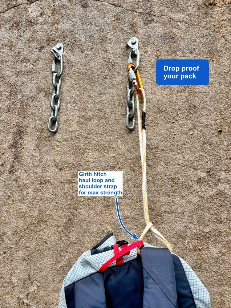 When multi pitch climbing, you want to be sure your pack is secure at the belay. Here's a simple way to do that.