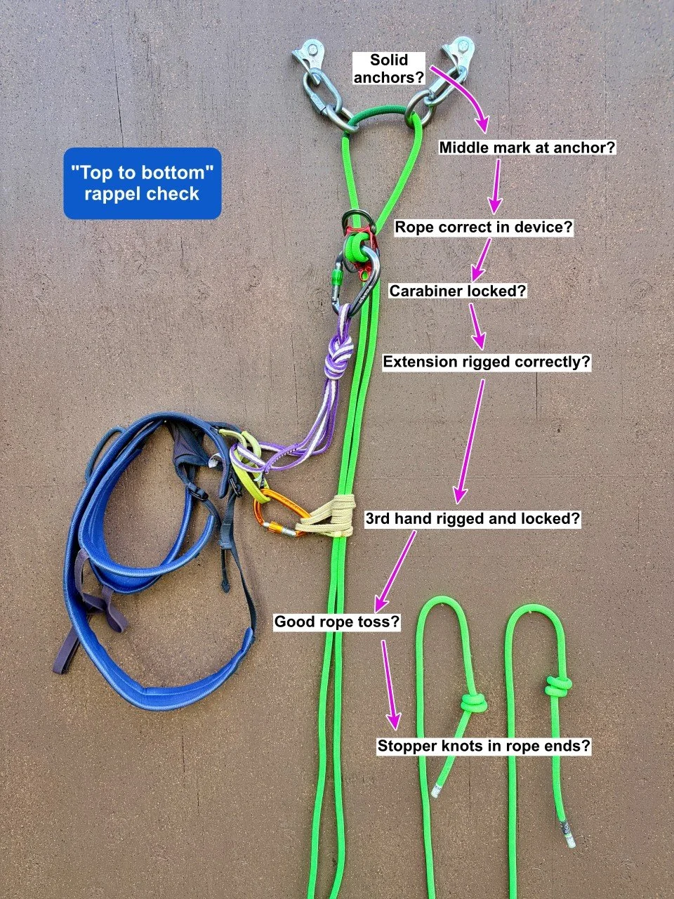 At a skills clinic I helped teach with (the late and great) IFMGA guide Rob Coppolillo, Rob shared a rappel safety check system that makes much more sense to me. He called it the “top to bottom” check.