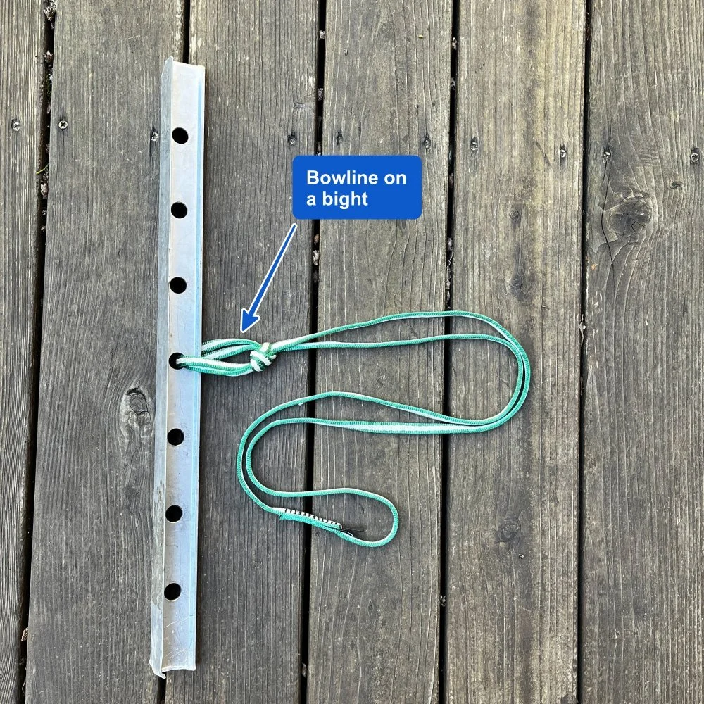 Next, clove hitch the rope to the second bolt. Adjust the clove as needed to more or less center the bight knot.
