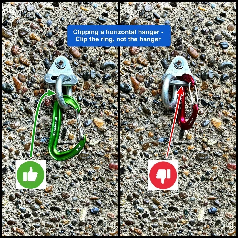 While most of the time it's not a big deal if you do clip the hanger, with certain carabiners in some configurations, the carabiners can get twisted and torqued in a strange way.