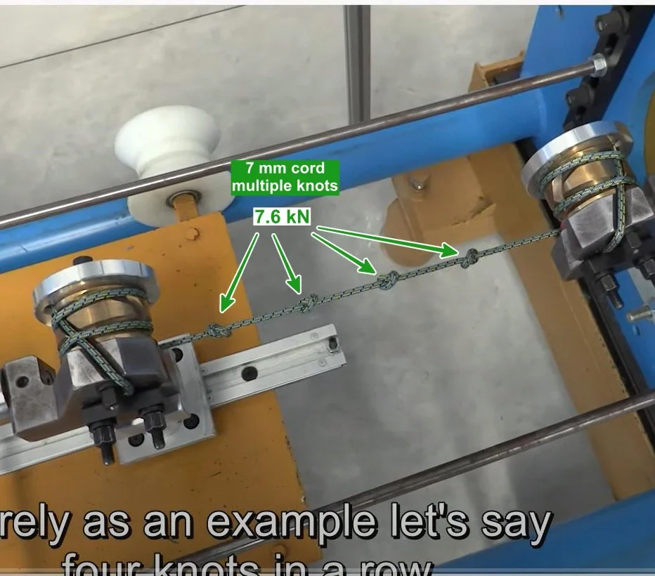 The strand with 4 knots broke at about the same force as the strand with 1 knot. This clearly shows that multiple knots do not decrease the cord strength multiple times. (Yes, it's pretty unlikely you would tie something like this in real life, but it proves the point)