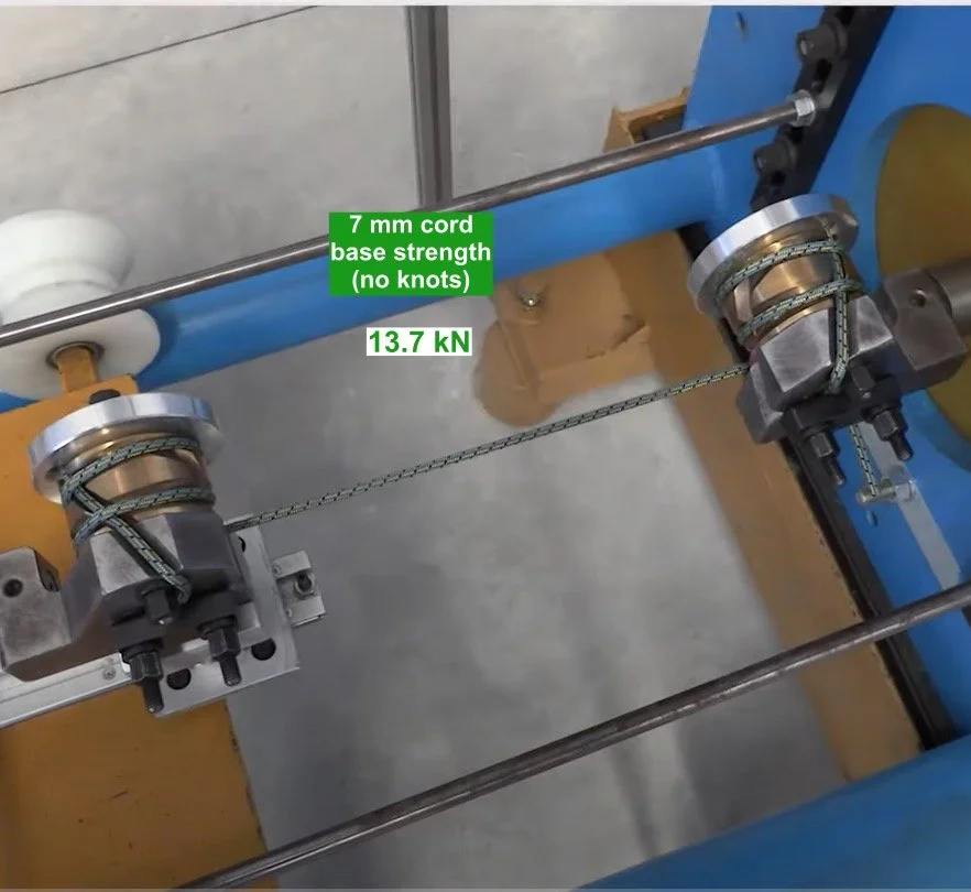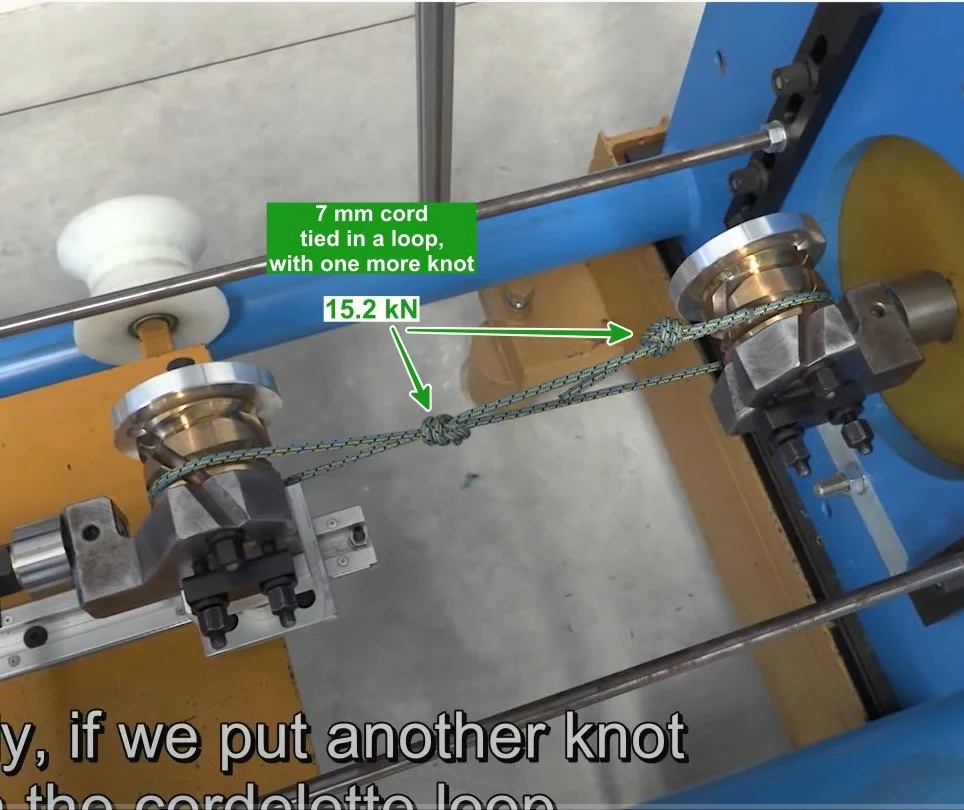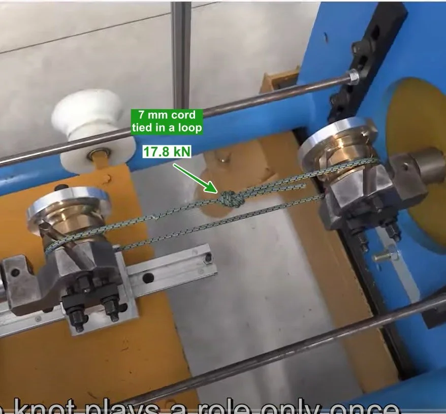 This one is a little strange. I would've expected this to break somewhere around half of the cord tied in a loop, or around 9 kN. But it's clearly a lot stronger than that. This is why real life testing is so interesting compared to the theoretical stuff!